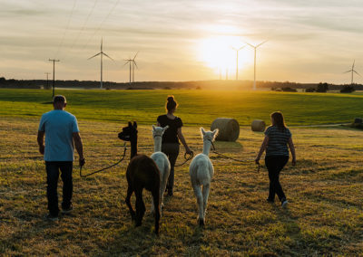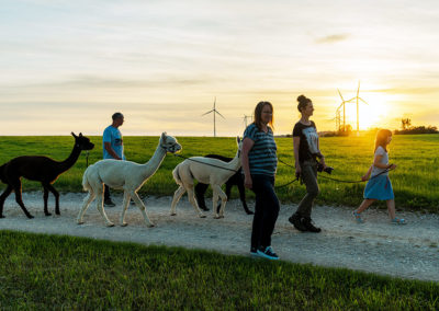 Der Treffpunkt einer Wanderung ist bei unseren Alpakas. Hier bekommen Sie erste Informationen über unsere Alpakas und eine kleine Einweisung zur Wanderung (Dauer, ca. 10-15min). Anschließend wandern wir ca. 1 ½ Stunden auf Feldwegen bzw. asphaltierten Wegen. Für Fotos ist zwischendurch natürlich immer Zeit. Wenn wir zurück sind, dürfen Sie unsere Alpakas mit einem Leckerli (das wir vorbereiten) belohnen. Abschließend dürfen Sie sich gerne noch in unserem Alpaka-Shop umschauen.